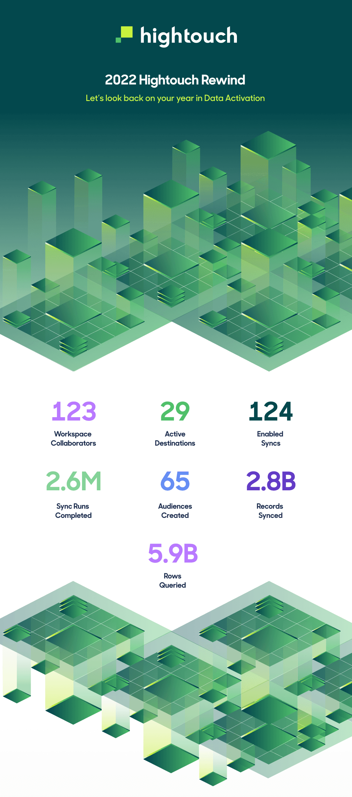 Halls are decked, cheer is spread, resolutions are…drafted (?!). And one more thing: it wouldn’t be a proper end-of-year reflection without a lookback blog post. Just today, we sent out an email to our customers titled ️**⭐️ 2022 in Review: Your Year with Hightouch** which consolidates all of their data activation stats and use cases into a shareable infographic.