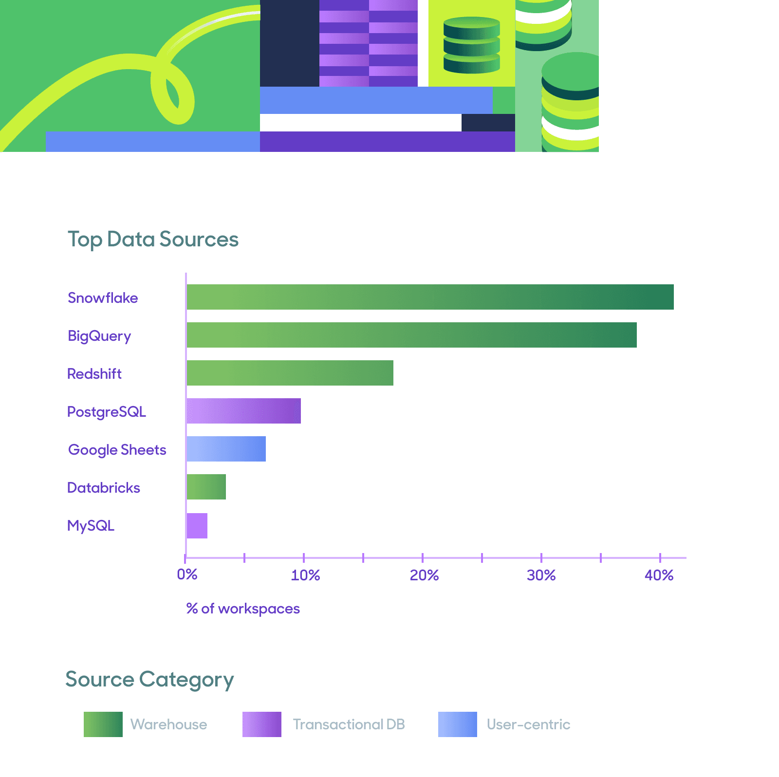 Below is a look at the relative popularity of various sources and destinations based on the number of workspaces syncing data to and from them.