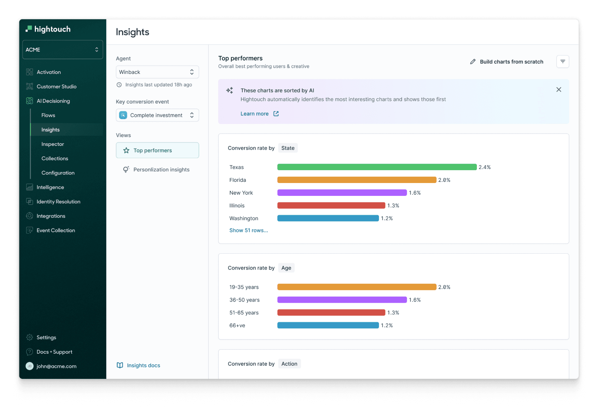 Next, Hightouch’s AI agents autonomously test different combinations of content, channels, and timing to begin optimizing each customer’s journey. Through reinforcement learning, the platform continuously refines its decisions based on customer feedback—whether positive or negative. You can clearly see why the AI made each decision, along with insights drawn from meaningful patterns in how customers engage with your campaigns.