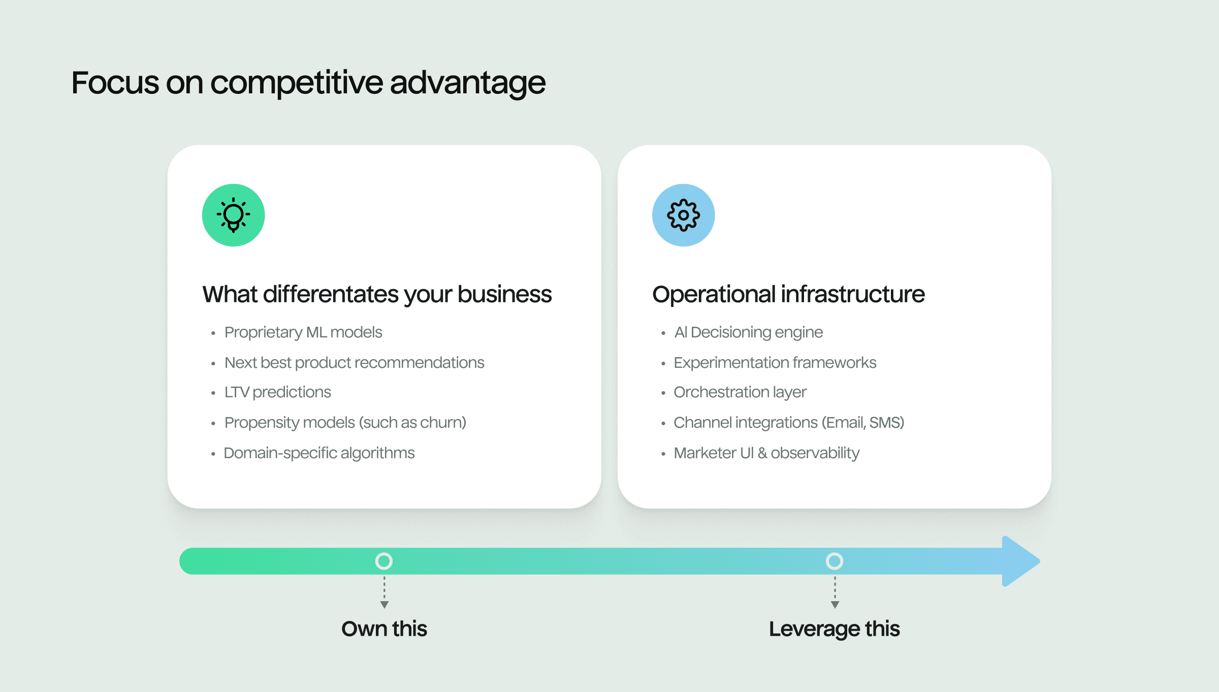 They successfully built contextual bandits that showed performance lift. But they couldn't build a platform that marketers could actually use. The algorithms worked, but the UI, observability, and integrations became the bottleneck. As their data science lead explained, "We built our own decisioning engine internally for two years. Although it showed lift, the tradeoff didn't make sense versus buying off the shelf and focusing on our data foundation and models that feed the platform."