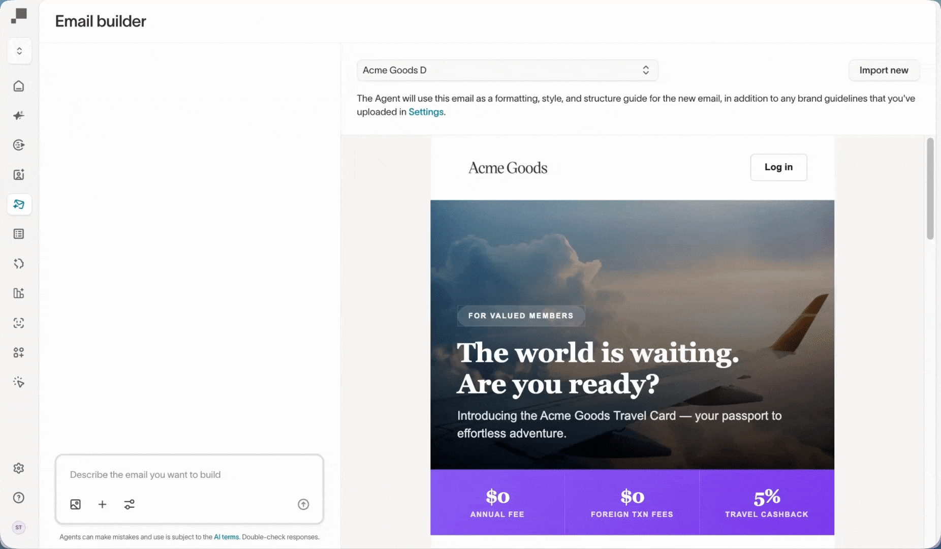 Marketers describe what they need in their own words–whether it’s 20 variations of one email or a net-new campaign across all channels. Agents search all of your systems (DAMs, Figma, Adobe, Google Drive, etc.) and intelligently assemble content from existing assets, including images, templates, and style guides.