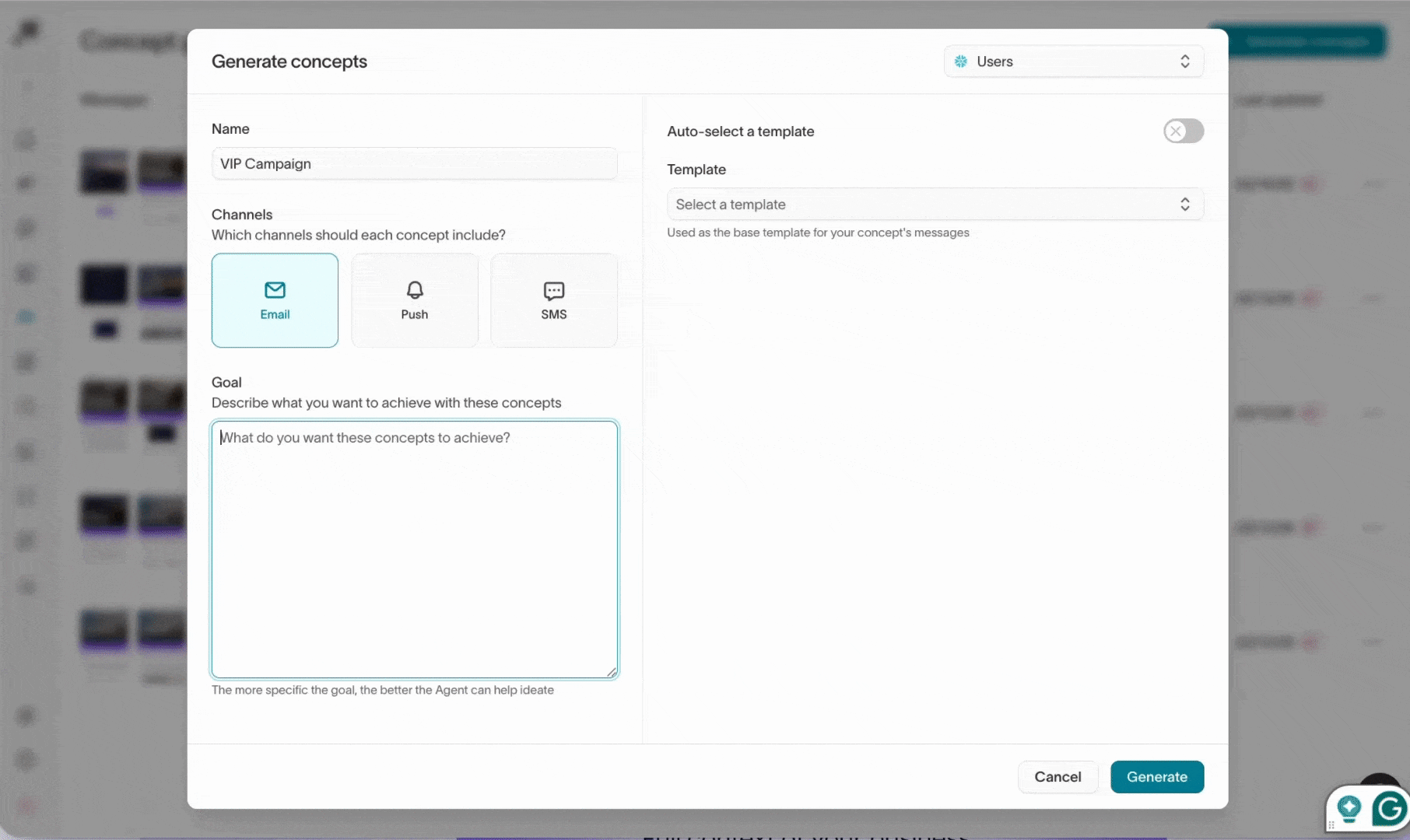 Generic AI tools tend to fail because they lack context. Their outputs look “reasonable” but are rarely on-brand. For content creation, context typically means brand guidelines and existing creative. When using Hightouch, you can either manually upload information in any format or directly connect to DAMs, design tools, and more.