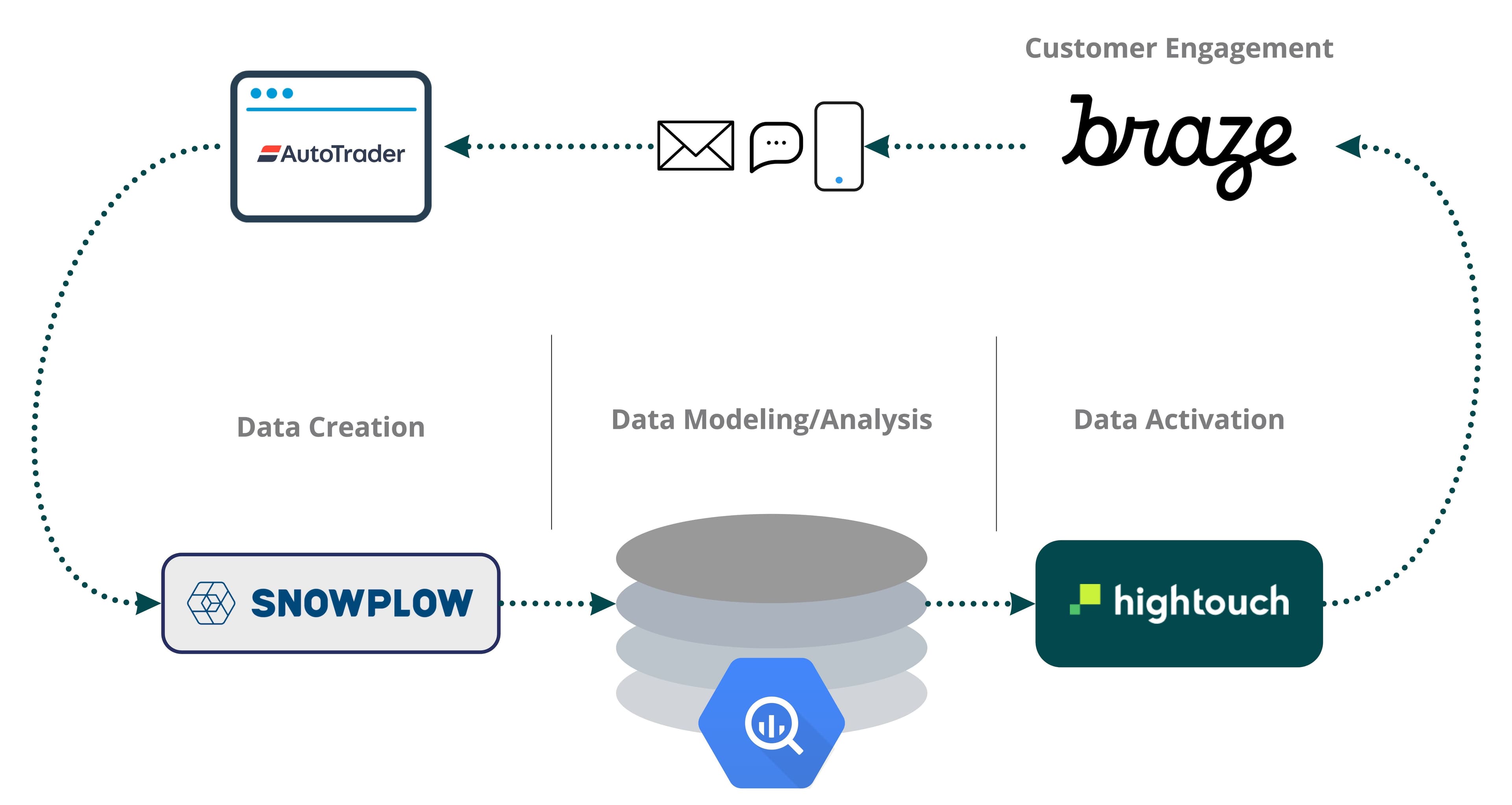 In search of a technology that would facilitate these needs, Autotrader discovered Reverse ETL and turned to Hightouch. Autotrader uses Hightouch to sync custom data models and audience segments created in BigQuery to Braze for lifecycle marketing.