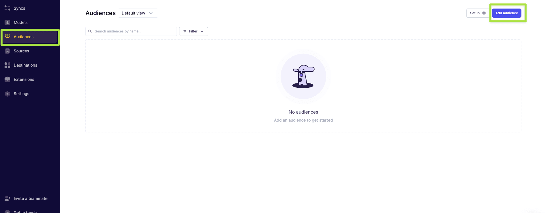 Please note that you will need the audiences feature enabled in Hightouch. To enable audiences, please request a demo here or reach out to our sales team.