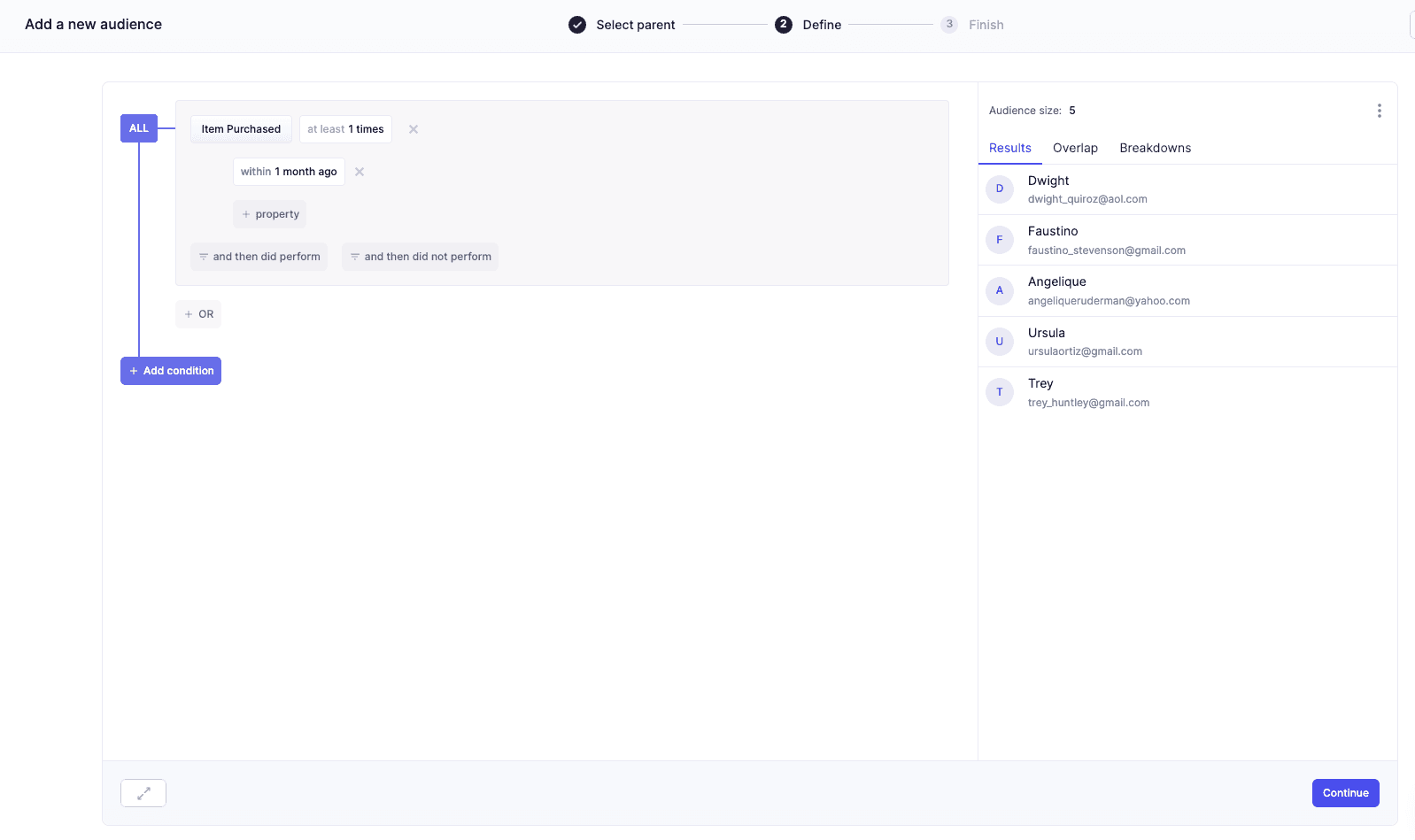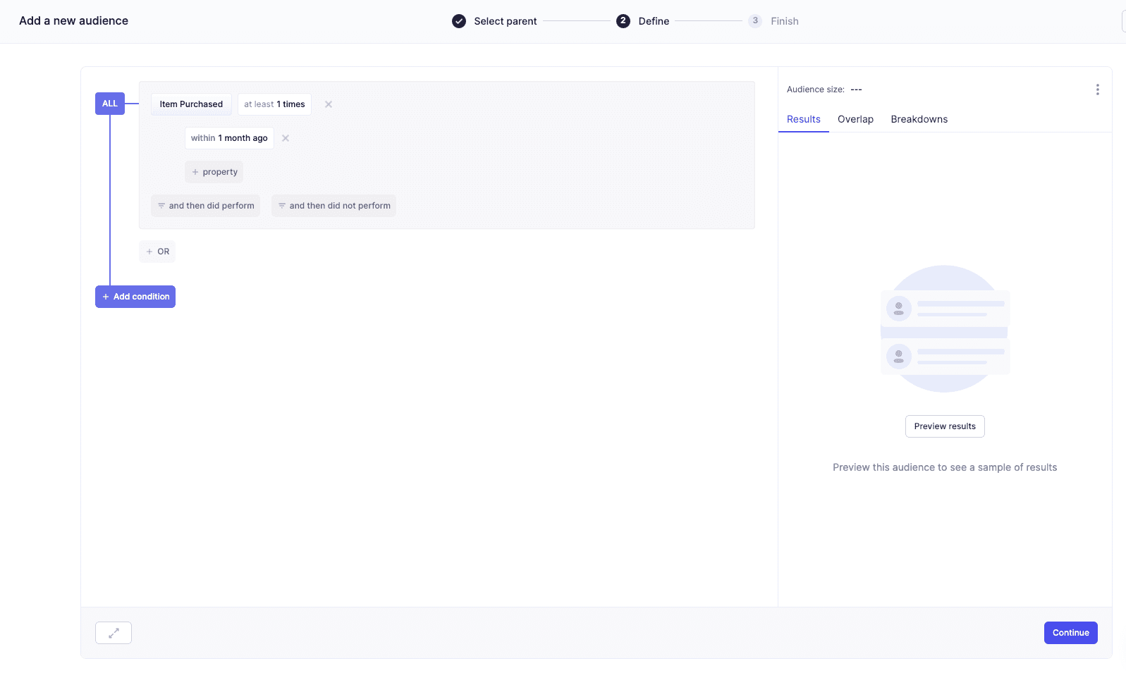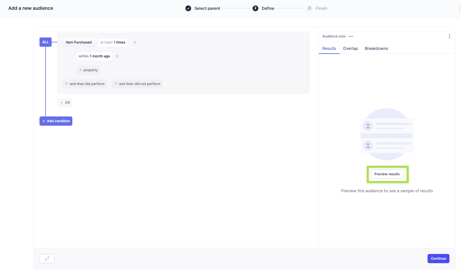Click Preview results to better understand your audience composition and click Continue to name and save your audience.