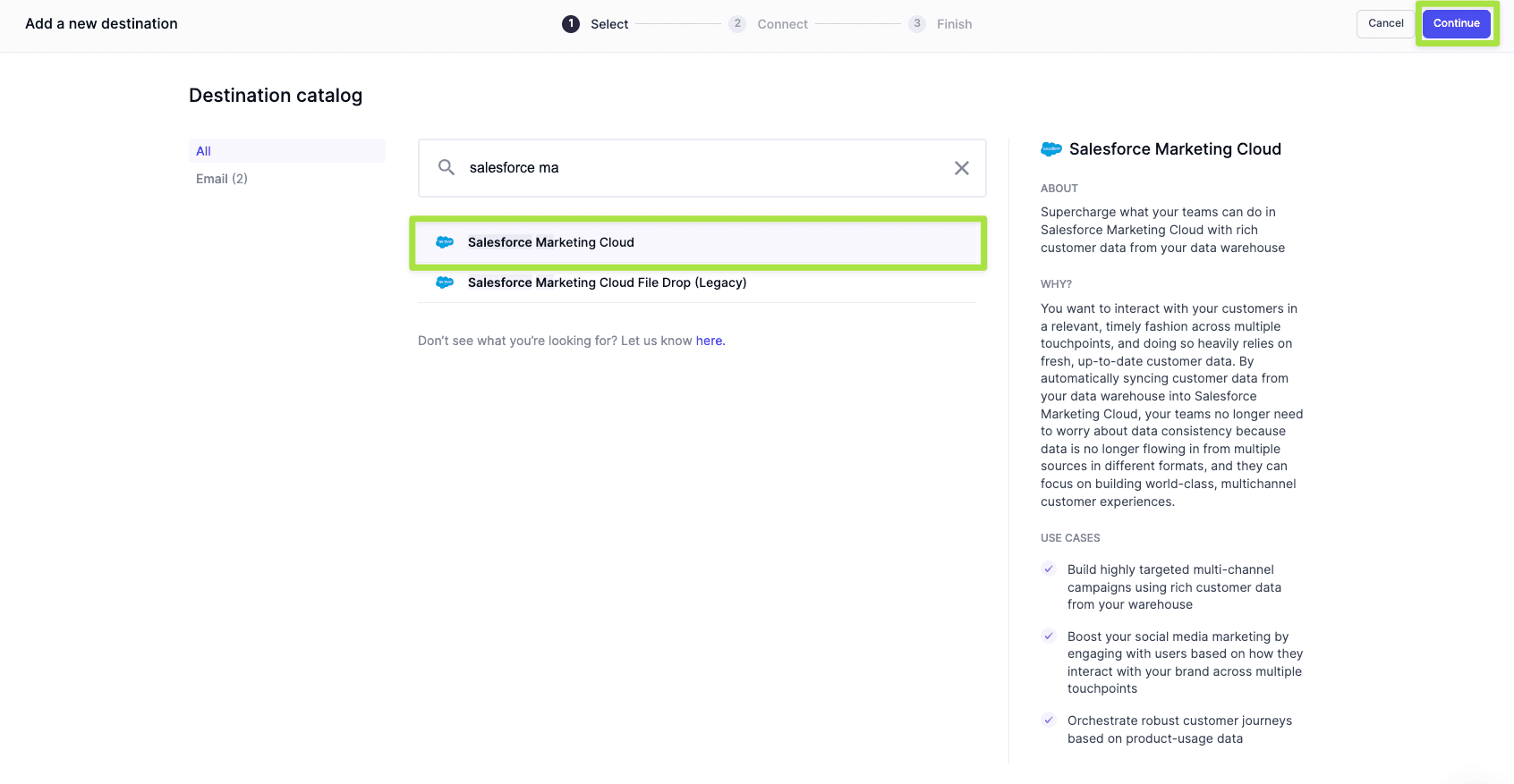 Navigate back to destinations and click Add Destination. Select Salesforce Marketing Cloud and click Continue.