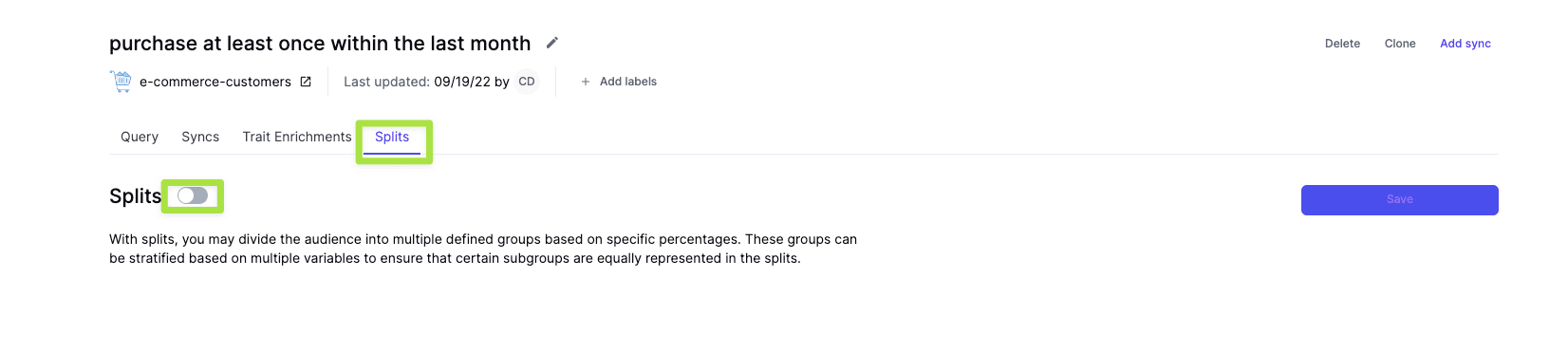 Using Hightouch, you can create your initial audience: people who have ordered something within the last month. Then, you can create your testing splits; Control, Test A, and Test B.