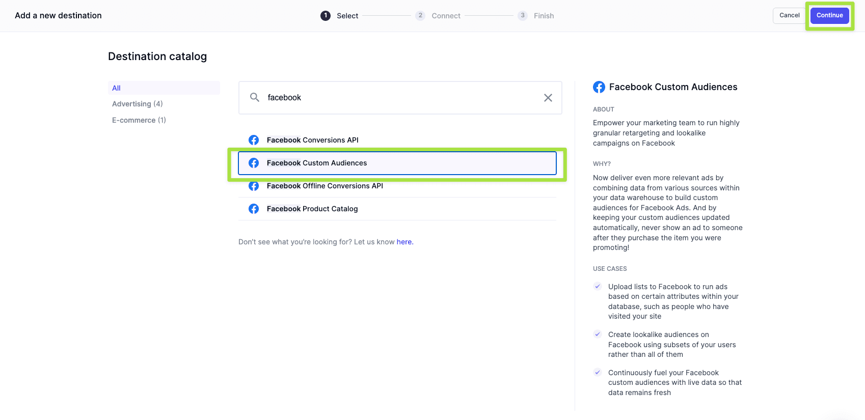 Navigate to destinations and click Add Destination. Select Facebook Custom Audiences and click Continue.